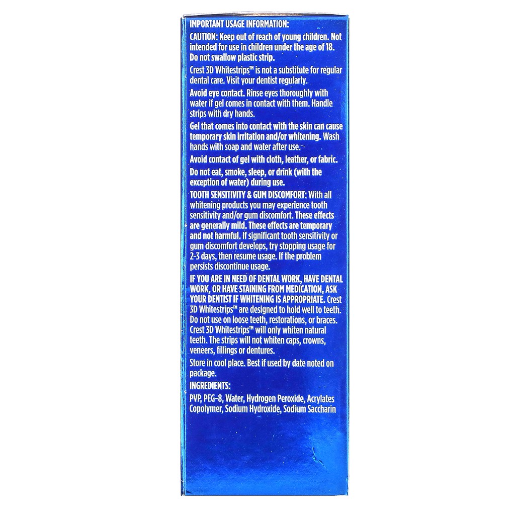 Crest 3D White Whitestrips are thin flexible strips that are coated with a tooth whitening gel. Best if used by date.